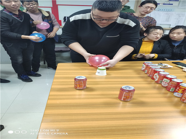 要求每隊出4人,接力吹氣球,再松開氣球口,用氣球跑氣時的氣流吹動紙杯,