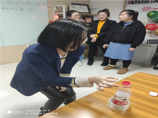 每隊選4人,按順序站好,原地捏鼻子轉(zhuǎn)3圈后,捂住一只眼睛向前走直線彈瓶蓋,